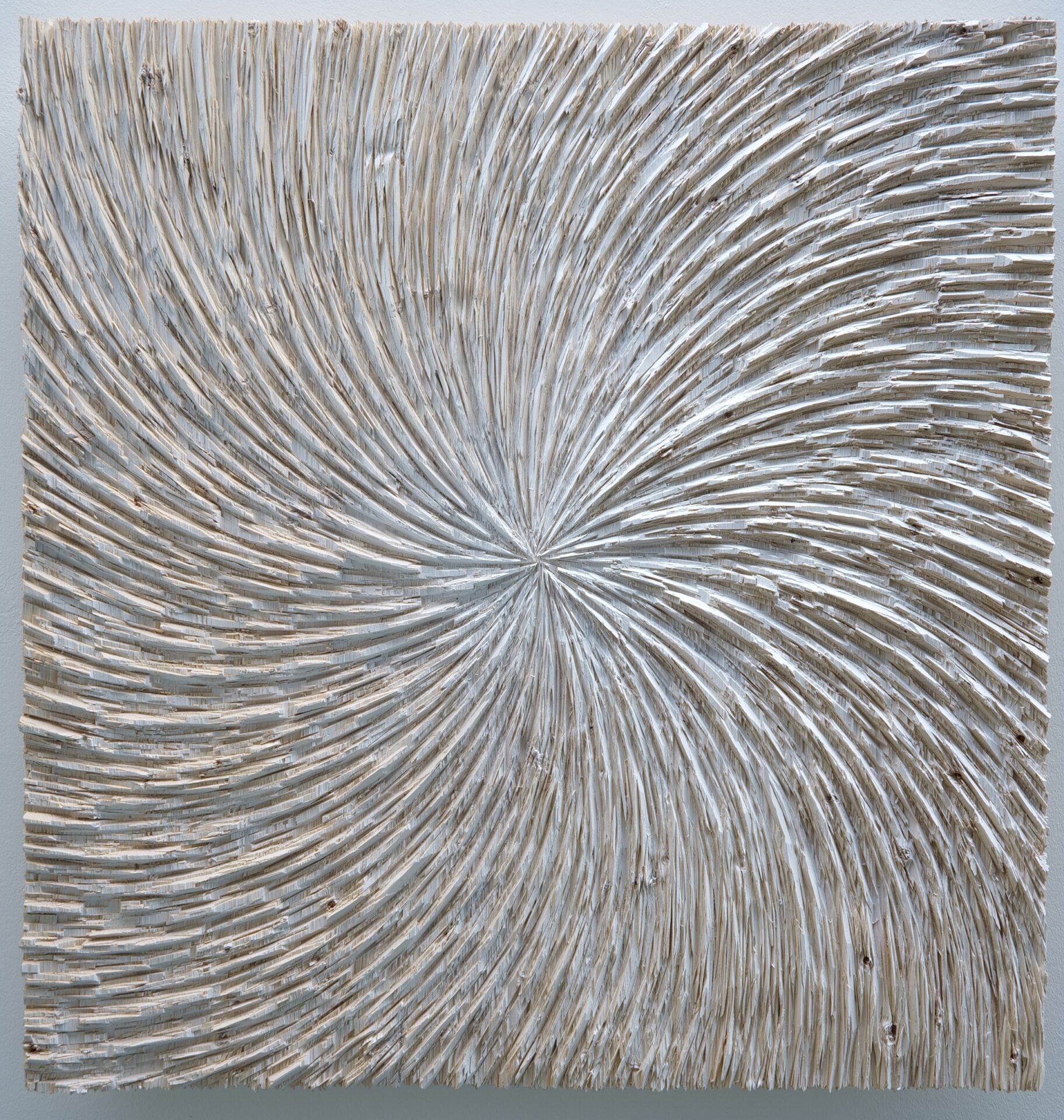 Monochrome wall object colored with acrylic paint, whose surfaces have been textured by deliberate axe blows.