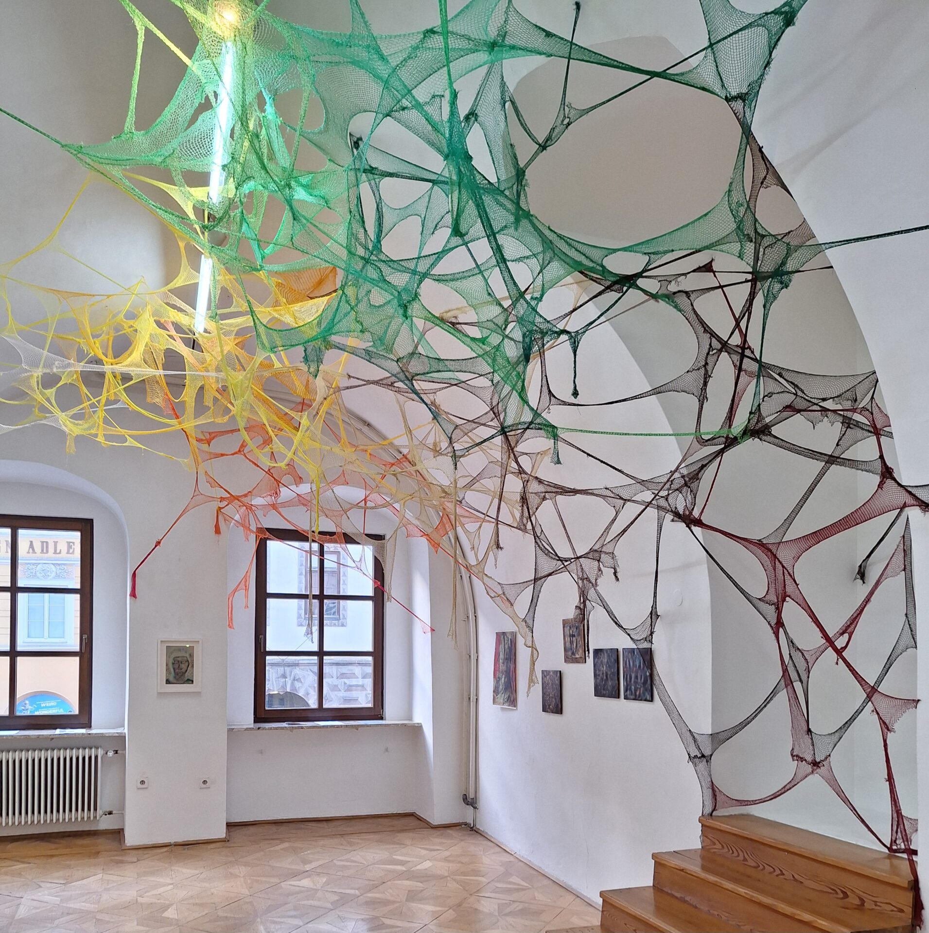 In Barbara Lindmayrs Netzinstallationen und Oelmalereien entfalten sich verschlungene Faeden zu komplexen Geflechten, die mehr als bloße Oberflaeche sind. Sie oeffnen einen dreidimensionalen Raum – physisch, emotional und narrativ. In ihrer Struktur und Symbolkraft erinnern diese Faeden an die mythologische Figur der Arachne, deren Gewebe zu Traegerinnen von Geschichten, Konflikten und innerer Wahrheit wurden. Wie Arachne nutzt auch Lindmayr das textile Motiv, um Bedeutungsrauume zu erschließen: Ihre Malerei wird zum Netz, das den Blick faengt, zum Ort verdichteter Tiefe und Spannung. So verknuepft sie Vergangenheit und Gegenwart, Mythos und Malerei, Flaeche und Raum zu einem vielschichtigen visuellen Erleben.