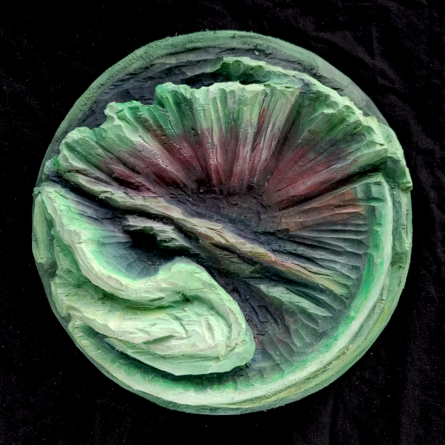 In this relief, a fan-shaped northern light rises from the center of the sky on a moonlit night and extends from northwest to southeast.