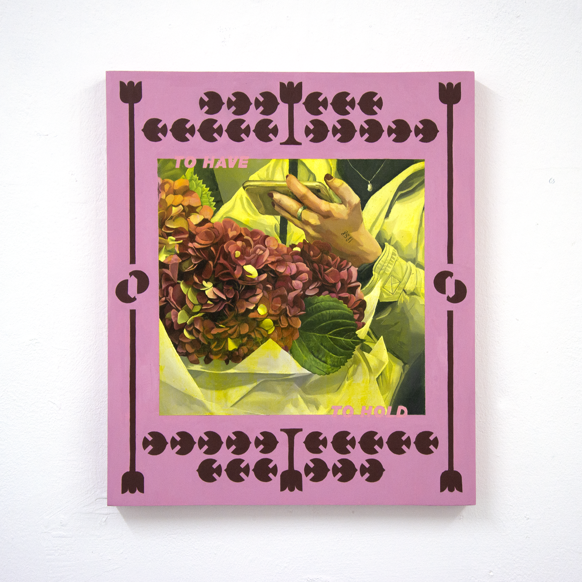 To Have, To Hold depicts a scene often found on a subway train. At the heart of the composition, a bouquet of hydrangeas sits cradled in paper. Hovering just above the blossoms, a woman dressed in a green jacket clutches a smartphone. A green glaze further evokes the artificial light of a train carriage.